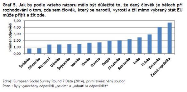 Fakt, že je nově příchozí na území daného státu běloch, je nejdůležitější v České republice, Estonsku a Polsku. Oproti tomu nejméně důležité je v Švédsku, Německu a Nizozemí. Obyvatelé České republiky považují fakt, že je imigrant běloch podobně v předchozím případě za další důležitý aspekt.