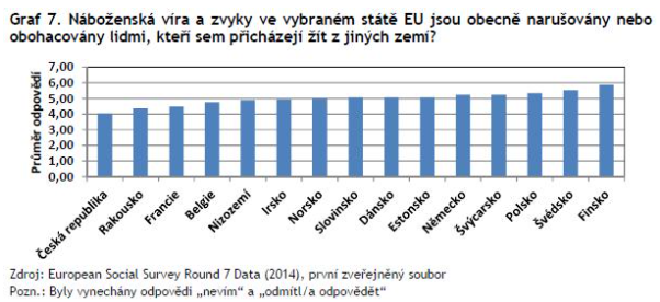 U této otázky bylo možné rovněž vybrat odpověď ze škály, a sice 0 označovala „náboženská víra a zvyky jsou narušovány“ a hodnota 10 znamenala „náboženská víra a zvyky jsou obohacovány“. Pro zjednodušení je i zde využito zobrazení průměrných hodnot. Jako obohacení náboženské víry a zvyků vnímají imigraci ve Finsku, Švédsku a Polsku. Oproti tomu za narušení ji vnímají v České republice, Rakousku a Francii.