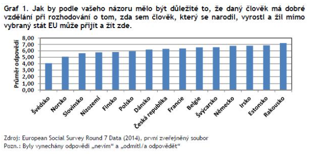 Na tuto otázku bylo možné vybrat odpověď ze škály 0–10, kde 0 znamenala „naprosto nedůležité“ a 10 „naprosto důležité“. V Grafu 1 jsou zobrazeny průměrné odpovědi, tedy čím vyšší průměr, tím vyšší důležitost má daná charakteristika. Dobré vzdělání je nejdůležitější v Rakousku, Estonsku a Irsku. Naopak nejméně důležité je ve Švédsku, Norsku a Slovinsku. Česká republika se umístila ve středu.