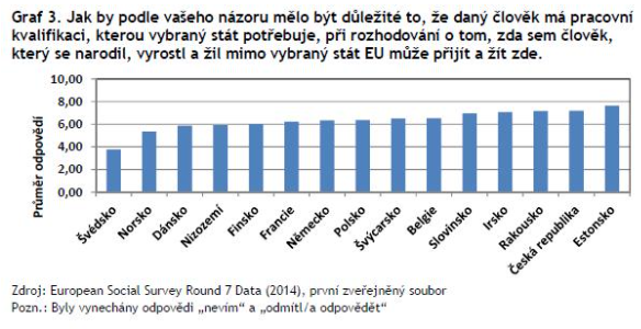 V případě pracovní kvalifikace potřebné v daném státě se mohou dostávat imigranti do konfliktu s místními obyvateli, jelikož ti mohou mít pocit, že jim příchozí obsazují pracovní místa. Jak uvádí Jackson a Esses (2000) na příkladu USA a Kanady, velký podíl obyvatel se domnívá, že příchozí imigranti snižují počty pracovních míst pro místní obyvatele. Důležitost pracovní kvalifikace, kterou daný stát potřebuje, je tedy nutné vidět i ve vztahu k počtu pracovních míst, jež je možné v daném státě obsadit, ať už místními obyvateli, nebo imigranty (také Esses, Dovidio, Jackson, Armstrong, 2001). V případě příchozích imigrantů má tato pracovní kvalifikace nejvyšší vliv v Estonsku, České republice a Rakousku. Naproti tomu nejméně důležitá je ve Švédsku, Norsku a Dánsku. Obyvatelé České republiky jako jedni z nejvíce ve vybraných zemích Evropské unie kladou důraz na potřebu pracovní kvalifikace imigrantů.