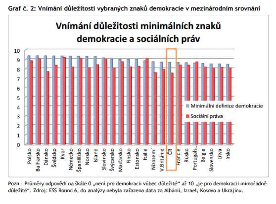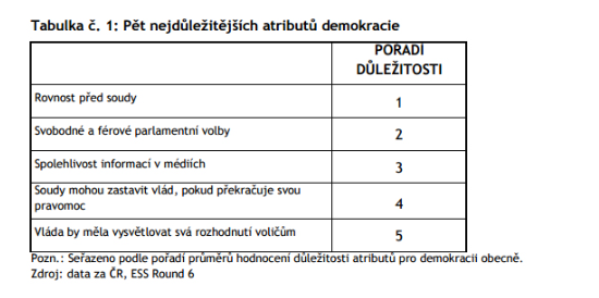 Nejdůležitějším znakem demokracie je pro Čechy rovnost před soudy, na druhém místě pak existence svobodných a férových parlamentních voleb (Tabulka č. 1). Třetím nejdůležitějším atributem demokracie v očích Čechů je schopnost médií přinášet občanům spolehlivé informace. Češi tedy chápou demokracii primárně v duchu základní definice, nejdůležitějšími atributy jsou pro ně práva a svobody, oblast sociálních práv jako nutnost snižování rozdílů v příjmech a ochrana všech občanů před chudobou zůstává v jejich interpretaci demokracie až na posledních místech.