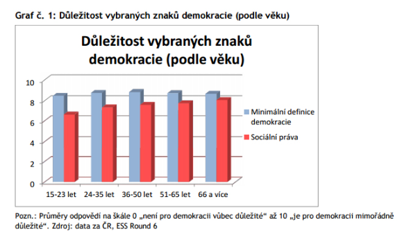 Důležitost sociálních práv roste s věkem, čím starší je člověk, tím větší váhu přikládá úloze státu při snižování příjmových rozdílů a v otázce ochrany občanů před chudobou. Rozhodně nejmenší podporu mají sociální práva u nejmladší věkové kategorie, která reprezentuje pouze lidi, kteří celý svůj dosavadní život prožili v demokratickém státě (Graf č. 1). Podobně souvisí tato otázka se vzděláním a sociálním statusem. Má-li člověk potíže vycházet se svým měsíčním rozpočtem, očekává od demokratického státu větší aktivitu při zabezpečení sociálních práv občanů. Vzdělání ovlivňuje zejména postoje k důležitosti svobodných a férových voleb, které představují pro vysokoškoláky nezpochybnitelný znak demokracie častěji než pro lidi s nižším vzděláním.